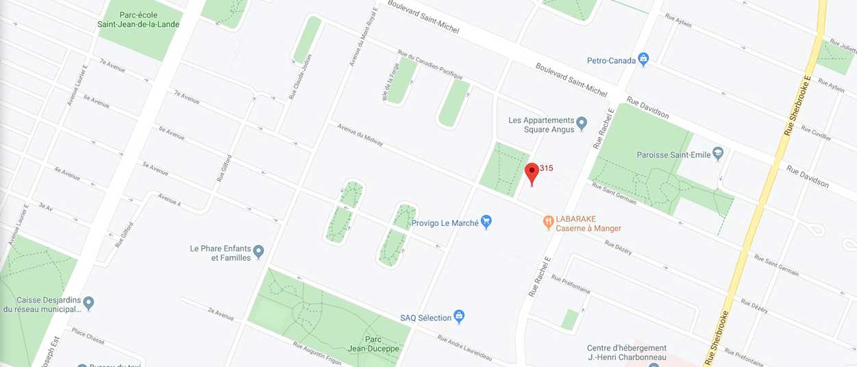 - Autobus 97, des stations de métro Mont-Royal ou Pie IX (arrêt coin Rachel et Dézéry)